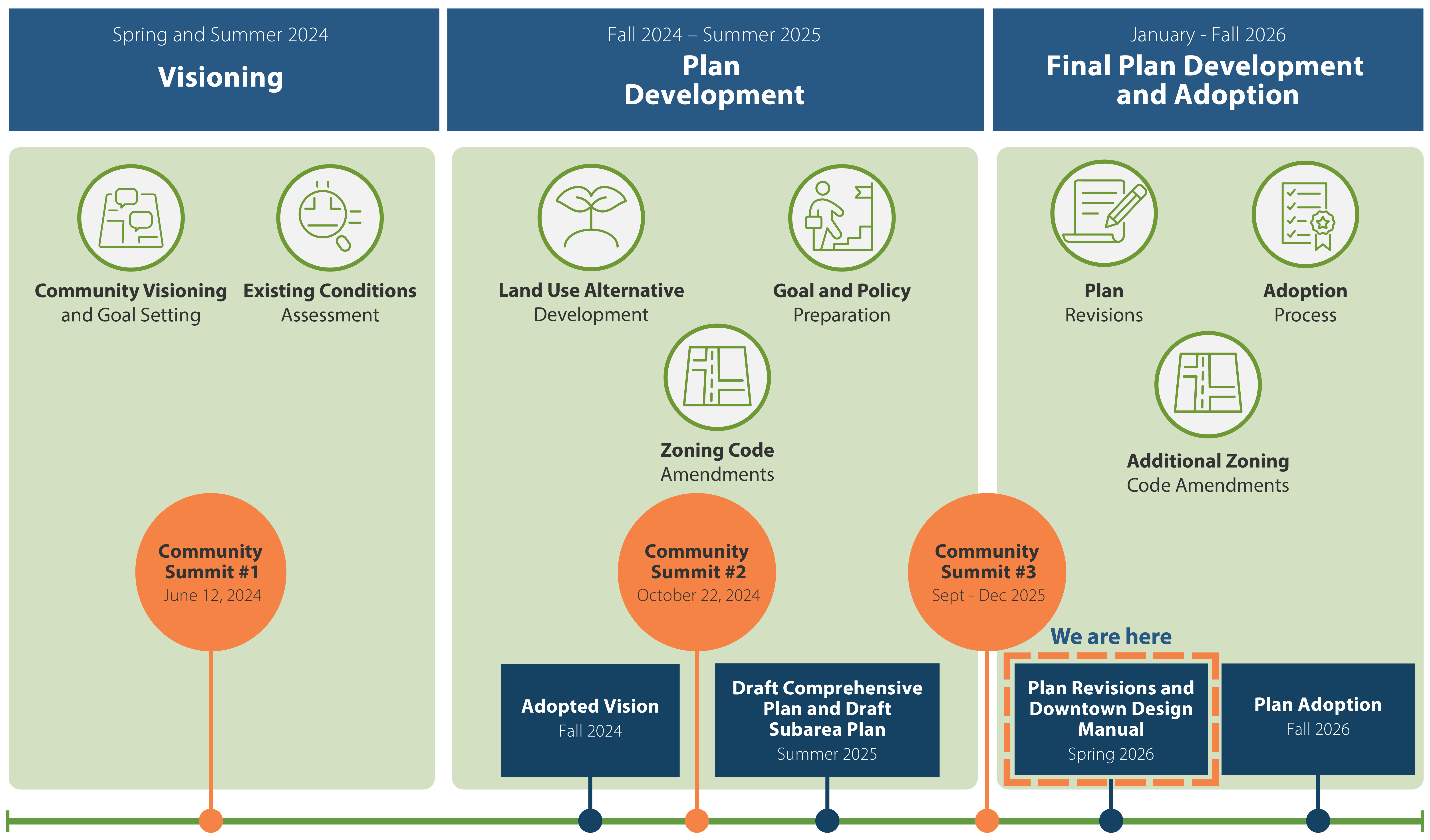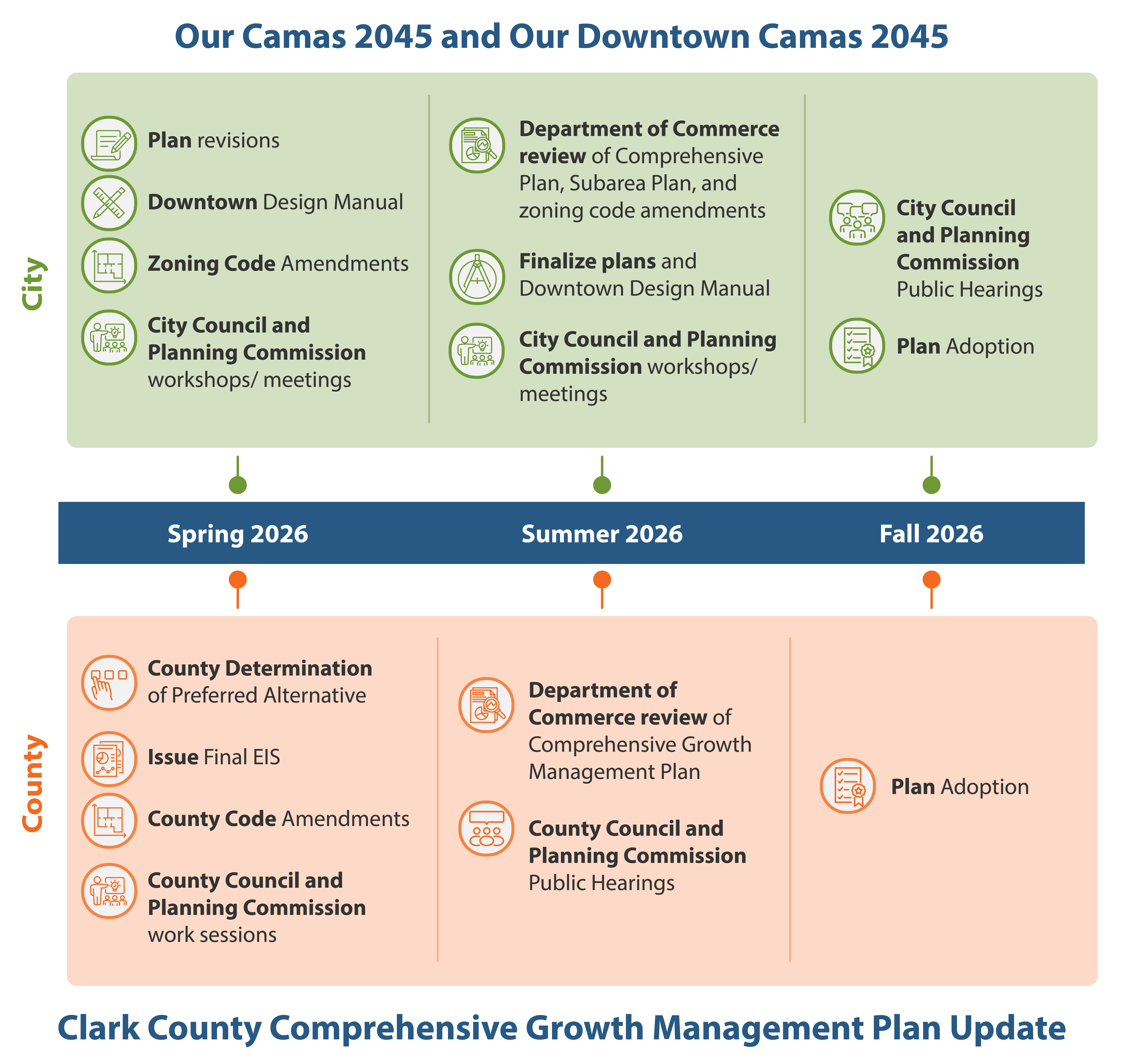 The schedule for next steps for Our Camas 2045 is shown in the figure below. The City plans to adopt the final Comprehensive Plan and Downtown Subarea Plan in Fall 2026.